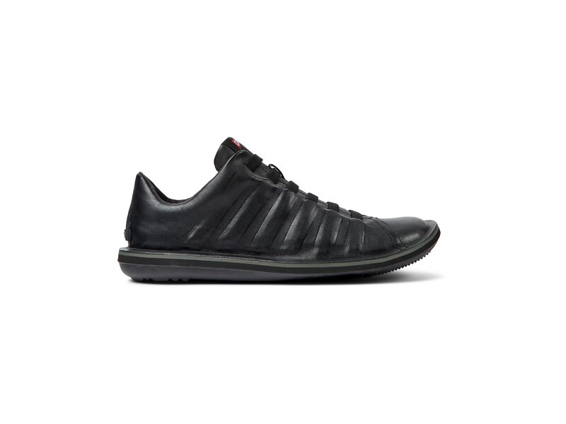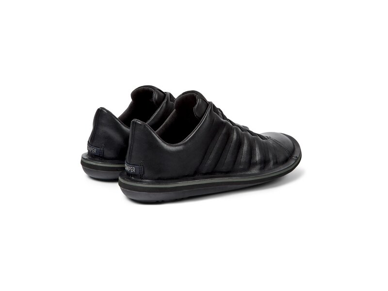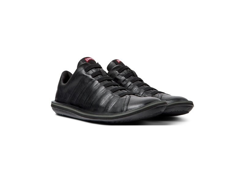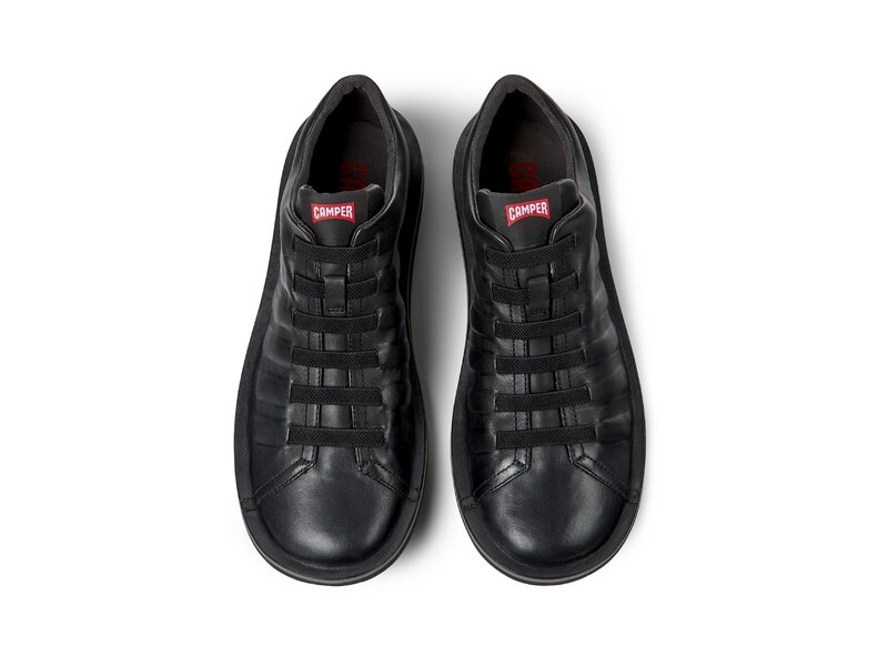 Schwarzer Herrenschuh aus Leder mit elastischen Schnürsenkeln und XL EXTRALIGHT® EVA-Laufsohle (51% Recyclinganteil). Ein Kultschuh aus dem Hause Camper, der sich jede Saison neu erfindet. Die versiegelte Konstruktion des Beetle für Herren ist leicht und flexibel und kombiniert die anatomische Passform mit einem charakteristischen Design.