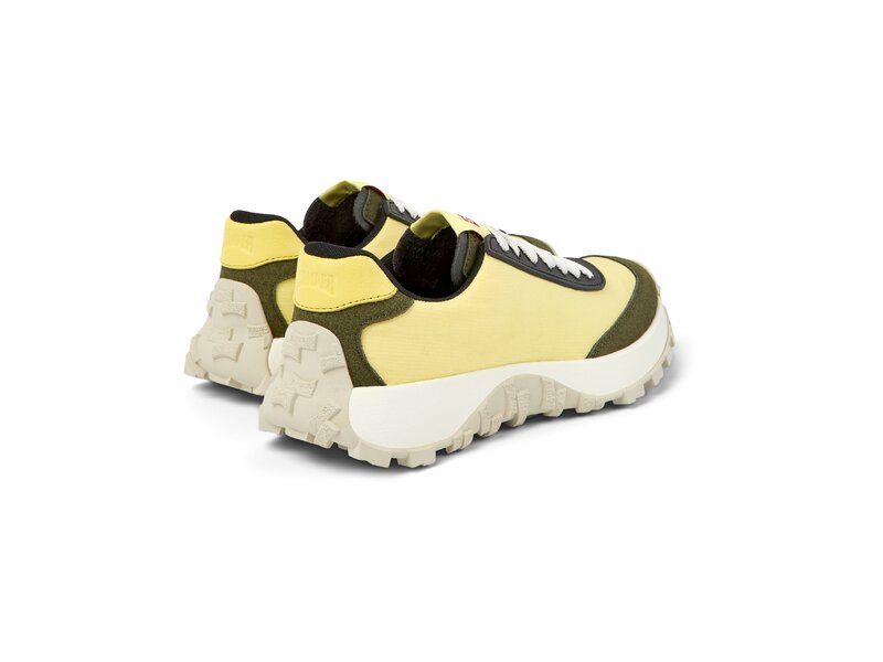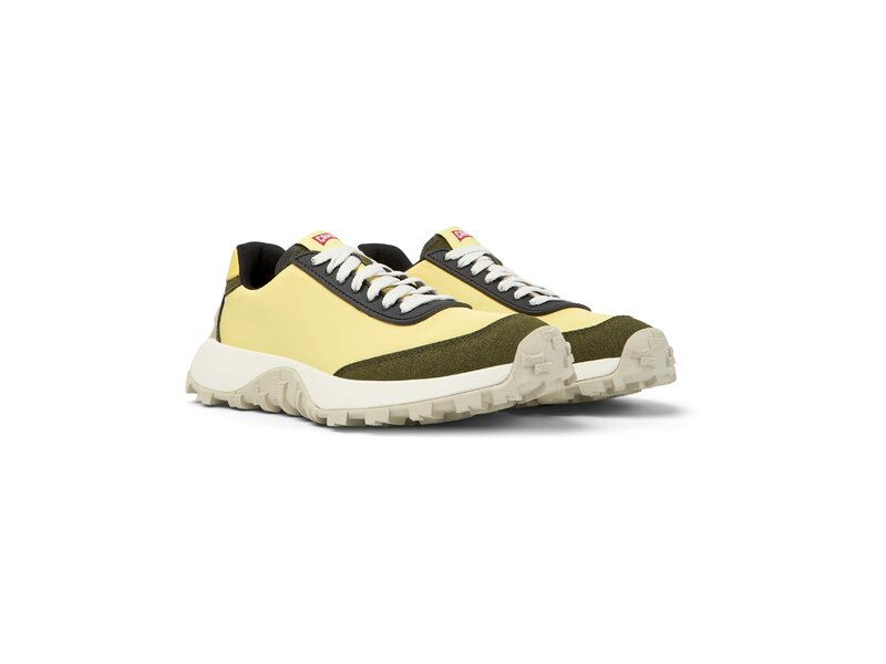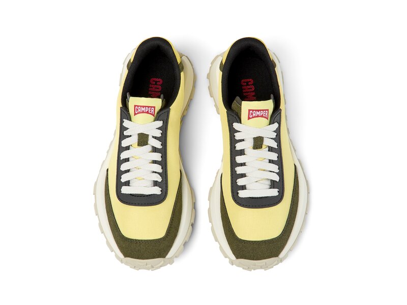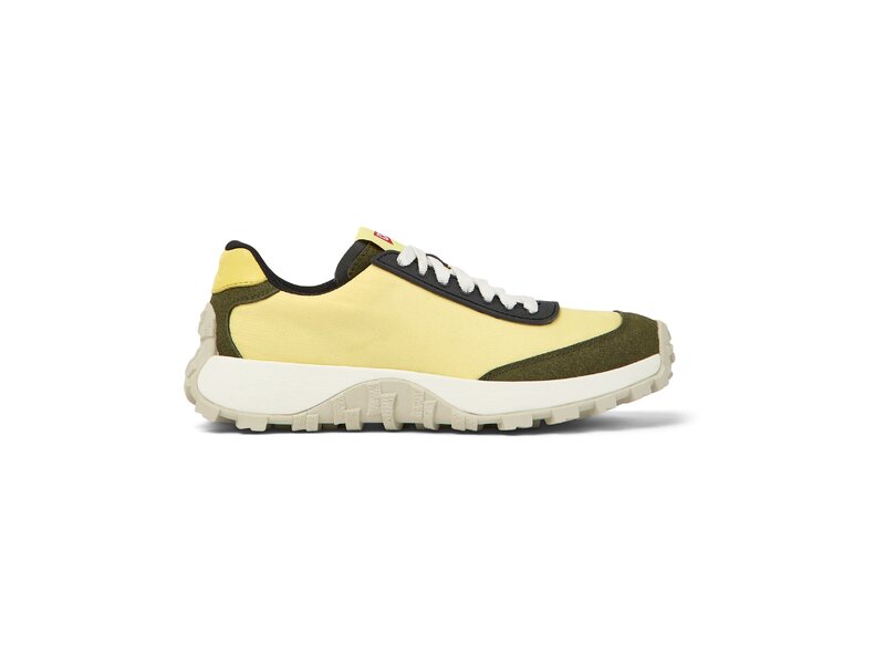 Gelber Damensneaker aus Textil und Nubukleder mit herausnehmbarem OrthoLite® Recycled™-Fußbett und Vibram®-Laufsohle (30% Gummi; 70% EVA). In unserem Drift Trail verbinden sich Hochleistung und Retro-Ästhetik.