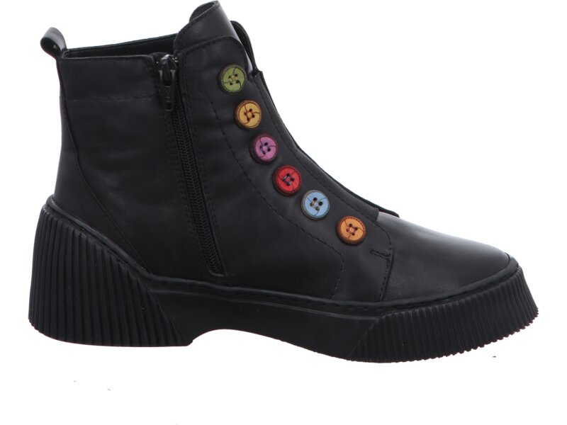 Der Gemini Damen Boot in Schwarz bringt Farbe in die graue Jahreszeit. Gefertigt aus weichem Rindsleder und verziert mit bunten Knopf-Applikationen, ist dieser Boot ein echter Hingucker. Die geriffelte Plateau-Laufsohle verleiht dem Schuh nicht nur einen modischen Akzent, sondern sorgt auch für ein angenehmes Laufgefühl. Dank der herausnehmbaren textilen Innensohle ist Komfort garantiert, während der Elastikeinsatz sich perfekt an Ihre Fußform anpasst. Der seitliche Reißverschluss und die praktische Schlaufe am Schaft erleichtern das An- und Ausziehen.