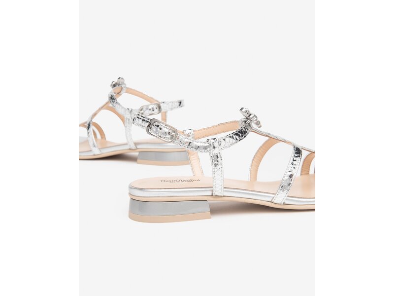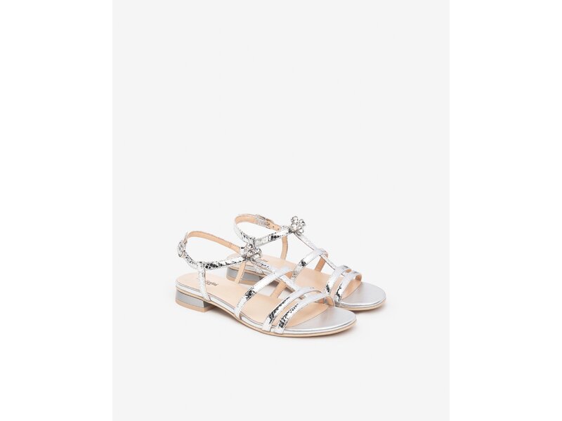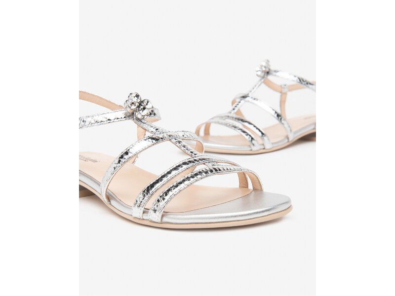 Flache Sandale in Silber mit Ornament.