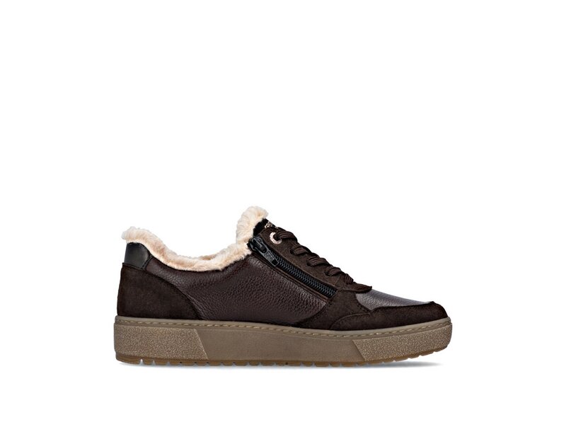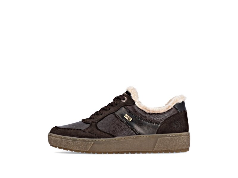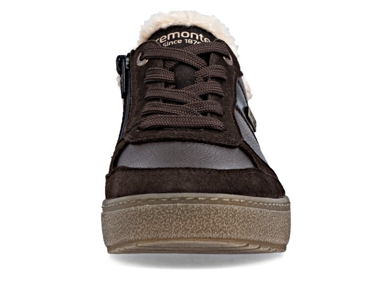 Hipper Zipper: Diese dunkelbraunen remonte Sneaker Low aus Glattleder haben alles, was ein bequemer Schuh braucht. Die geniale Kombination aus Schnürung und Reißverschluss ermöglicht ein einfaches An- und Ausziehen. Der flauschige Schaftrand frischt das Design gekonnt auf. Die dämpfende und griffige Sohle und die gepolsterte und herausnehmbare Einlegesohle verwöhnen die Füße mit umfassendem Komfort. Die Komfortweite bietet genügend Freiraum, damit sich die Füße auch bei längerem Tragen wohlfühlen. Die Kombination aus wasserabweisender remonteTEX-Membran und kuschligem Warmfutter sorgt für warme und trockene Füße bei jedem Wetter. Ganz nach dem Motto Komfort meets Style!