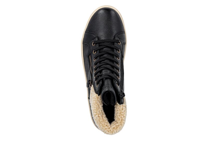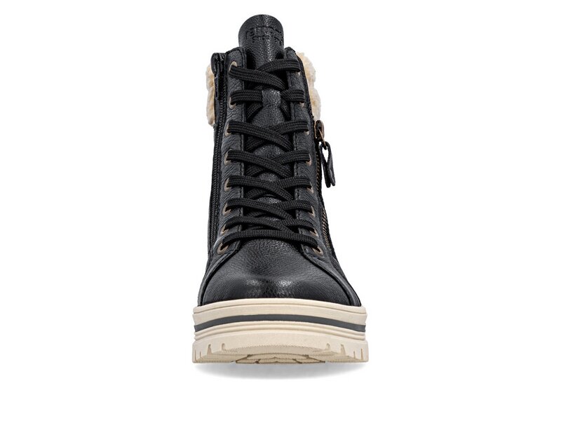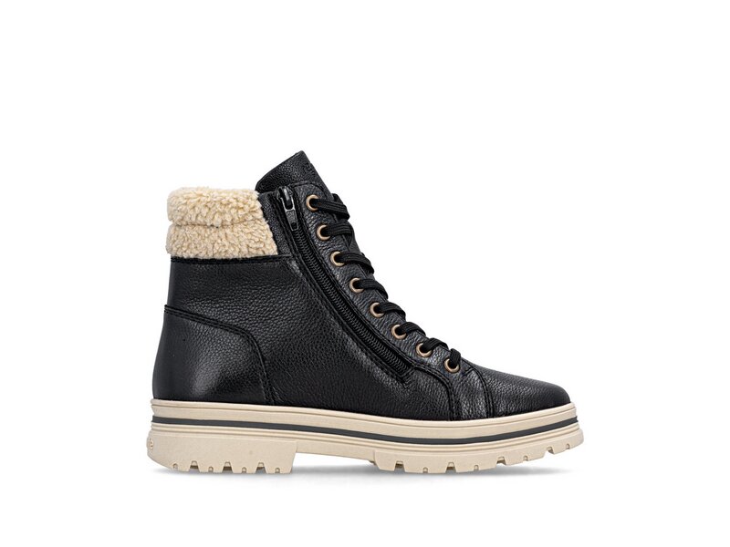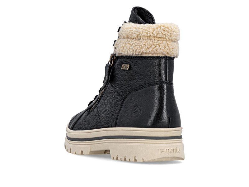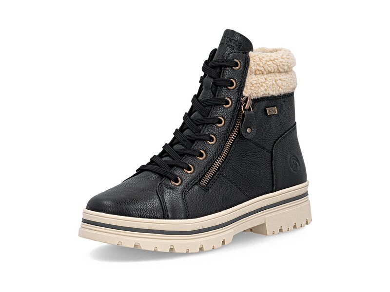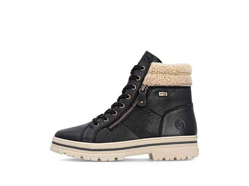 Kalte Tage, warme Füße! Diese komfortablen schwarzbeigen remonte Schnürstiefel aus Glattleder bestechen mit einem coolen Look und funktionaler Power. Die clevere Kombination aus Schnürung und Reißverschluss garantiert eine perfekte Passform und idealen Halt. Der Fellkragen am Schaft rundet den Look des Schuhs harmonisch ab. Mit der griffigen und leichten Sohle ist trittsicheres Gehen eine Selbstverständlichkeit. Die Komfortweite bietet den Zehen genügend Bewegungsfreiheit. Dank des wasserabweisenden Obermaterials ist Schutz vor Nässe und Wind gegeben, während die Einlegesohle mit Thermo-Effekt für Wärme im Schuh sorgt. Kuschelige und sehr warme Schurwolle hält die Füße warm. Da kommt Stimmung auf!