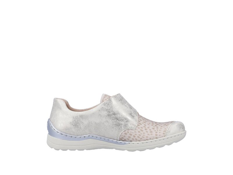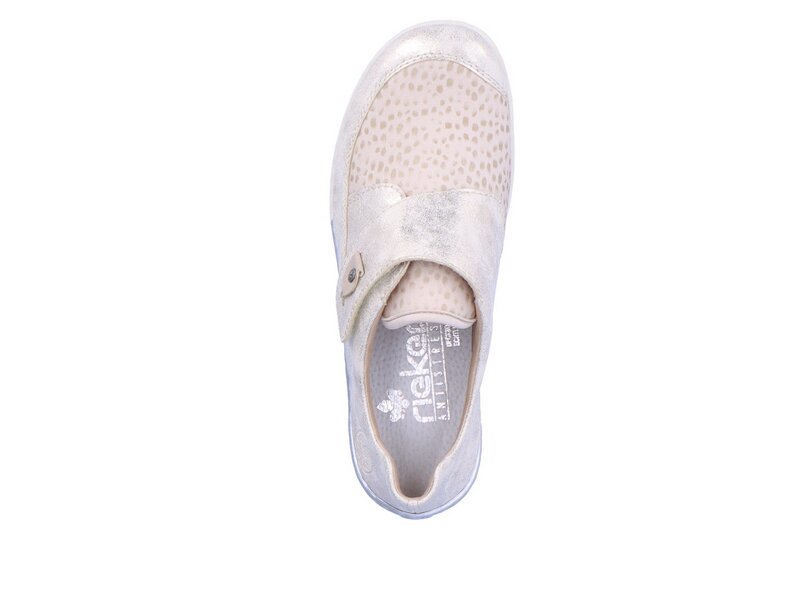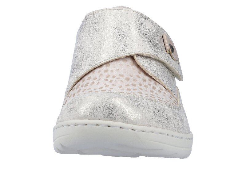 Auf dem Fashion-Radar! Diese beigen Slipper aus Kunstleder von Rieker überzeugen durch modernes Design und hohen Tragekomfort. Ein Klettverschluss ermöglicht einen schnellen und bequemen Einstieg. Die schockabsorbierende und leichte Sohle bietet anhaltendes Wohlgefühl ? auch an langen Tagen. Zudem sorgt die extra weiche Decksohle für eine Extraportion Tragekomfort. Durch die Extraweite H ist dir mehr Freiraum im Schuh geboten. Modisches Wellness-Feeling im Stil von Rieker!