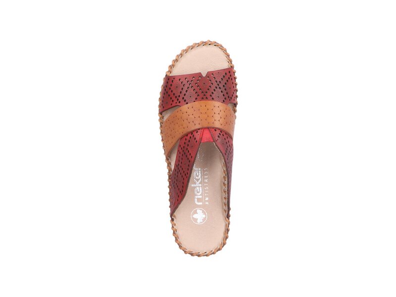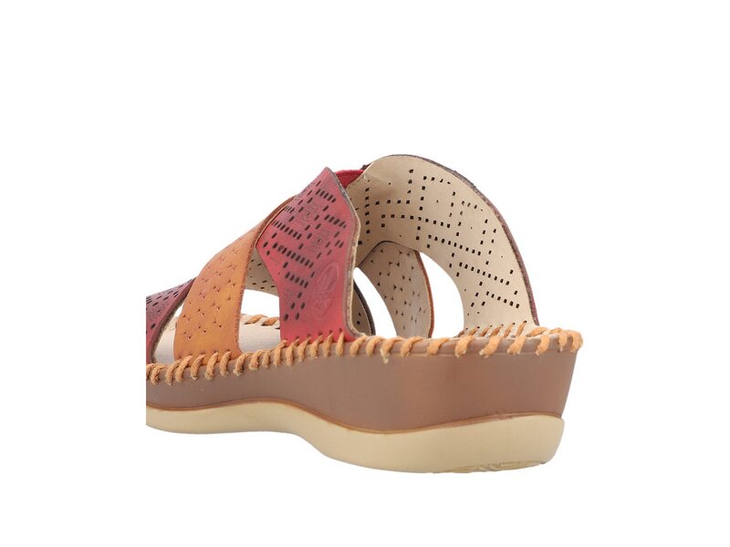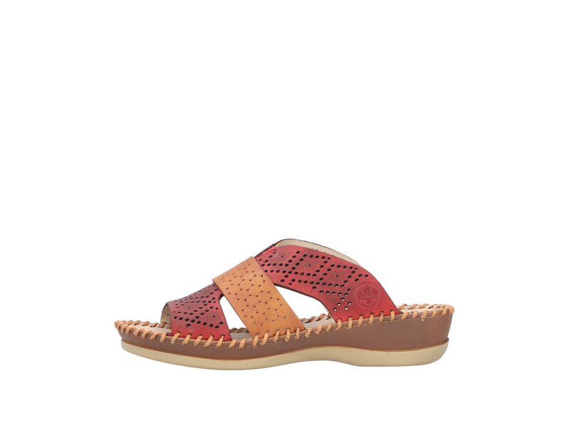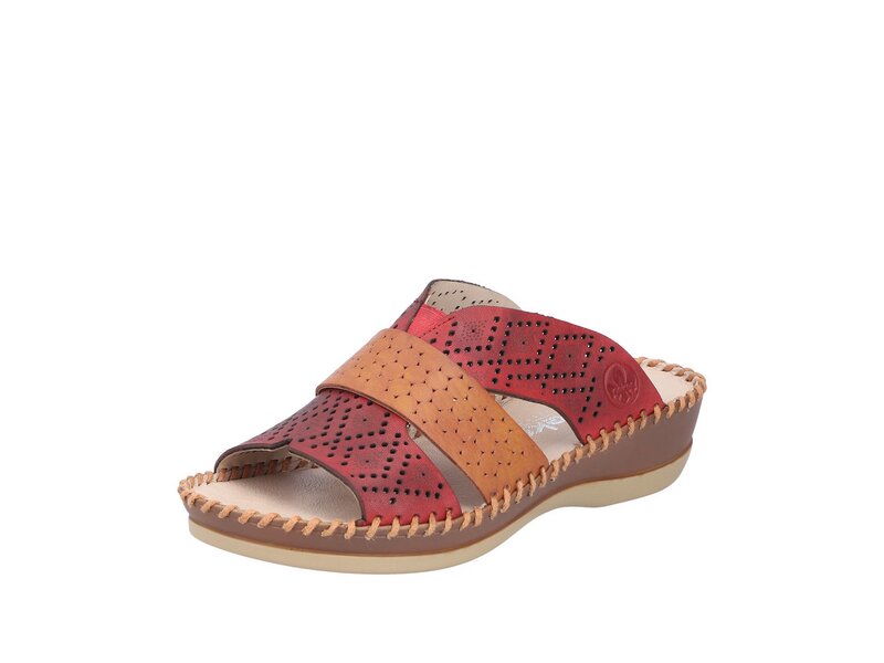 Bereit für den Sommer? Mit diesen kirschroten Rieker Pantoletten aus Glattleder bist du cool und lässig auf Achse. Der Schuh hat keinen Verschluss und kann so unkompliziert angezogen werden. Der durchbrochene Stil ist ein hübsches Detail. Der offene Schuh sowie die schockabsorbierende und leichte Sohle sorgen für anhaltendes Wohlgefühl. Zudem sorgt die extra weiche Decksohle für eine Extraportion Tragekomfort. Das Modell ist in Komfortweite G geschnitten und sichert dem Fuß genügend Freiraum. Mehr geht nicht!