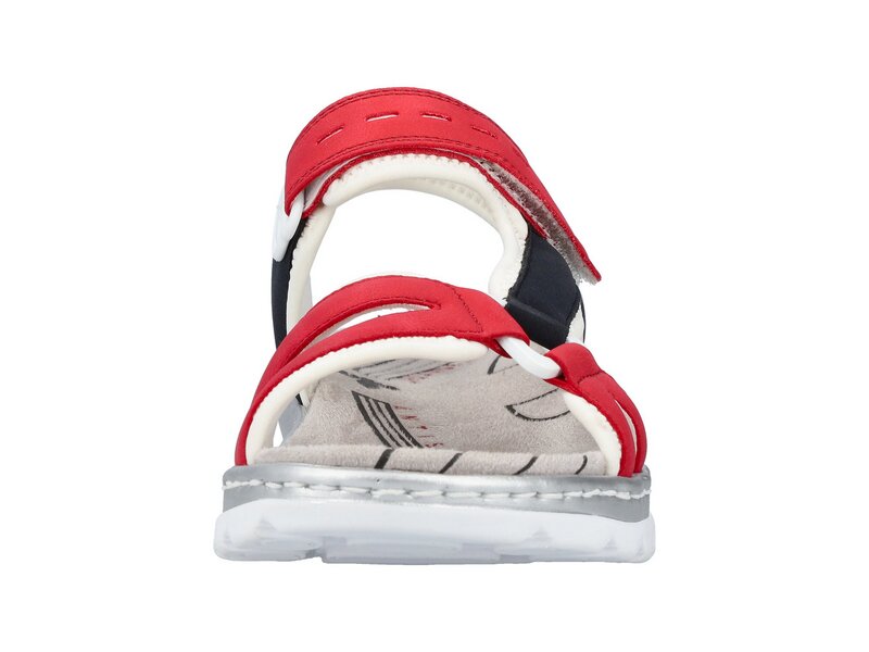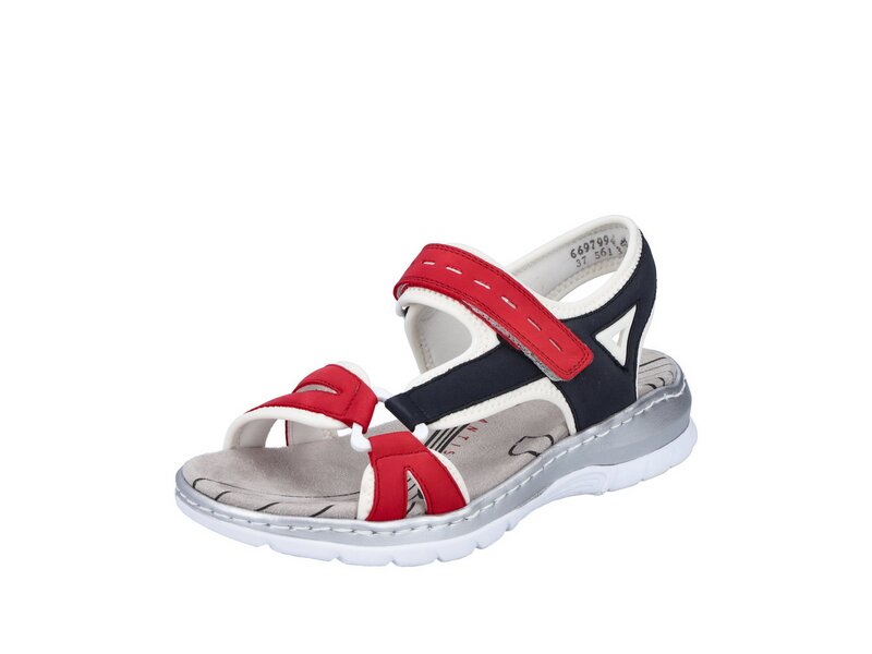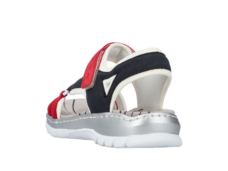 Komfort und gutes Aussehen - das geht! Diese feuerroten-blauen Trekkingsandalen aus Kunstleder von Rieker garantieren ein himmlisches Tragegefühl. Breite Riemen und ein Klettverschluss sorgen zusammen mit dem breiten Fersenband für idealen Halt. Die leichte und schockabsorbierende Sohle bietet anhaltendes Wohlgefühl ? auch an langen Tagen. Durch die schmale Passform E 1/2 bieten die Trekkingsandalen zusätzlichen Halt. Gesucht, gefunden!