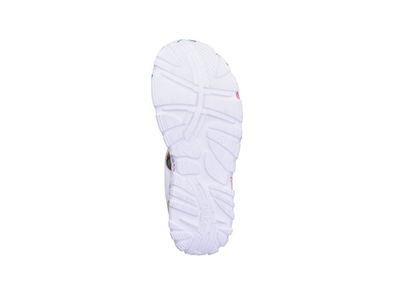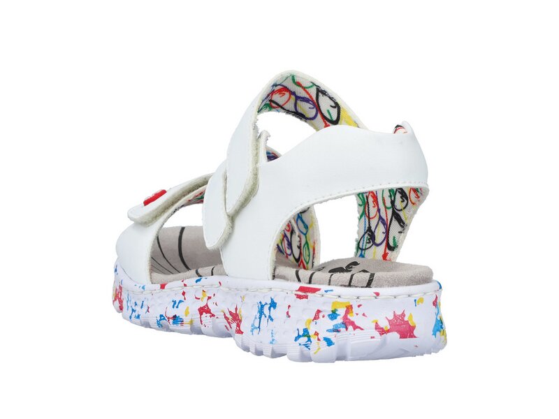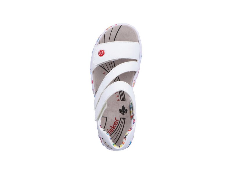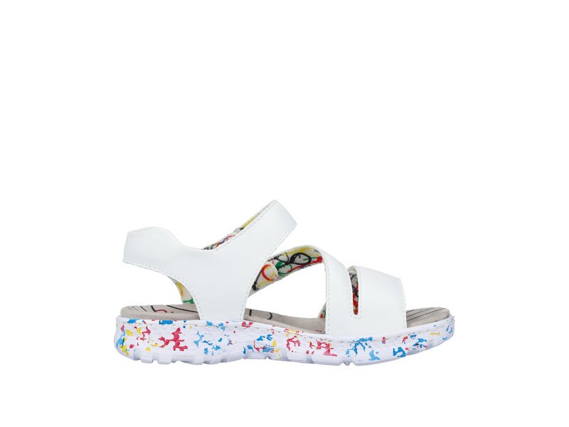 Achtung Lieblingsschuh-Potential! Diese lilienweiß-bunten Riemchensandalen aus Kunstleder von Rieker geben dem Fuß Freiraum und halten ihn dennoch sicher. Breite Riemen und ein Klettverschluss sorgen zusammen mit dem breiten Fersenband für perfekten Halt. Die flexible und ultra leichte Sohle verwöhnt die Füße zusätzlich bei jedem Schritt. Darüber hinaus bietet die schmale Passform E 1/2 zusätzlichen Halt. Wohlge(h)fühl inklusive!