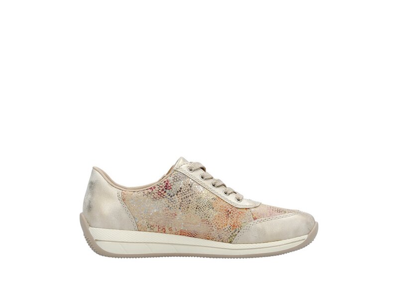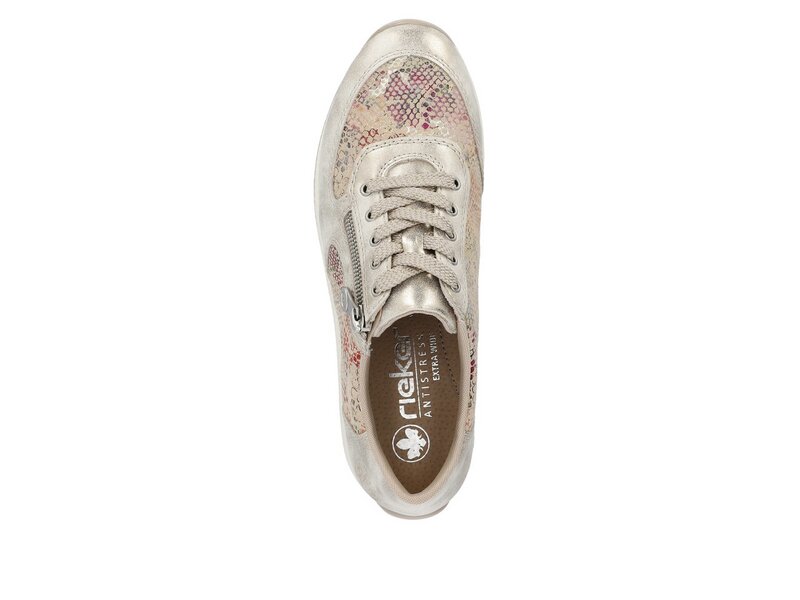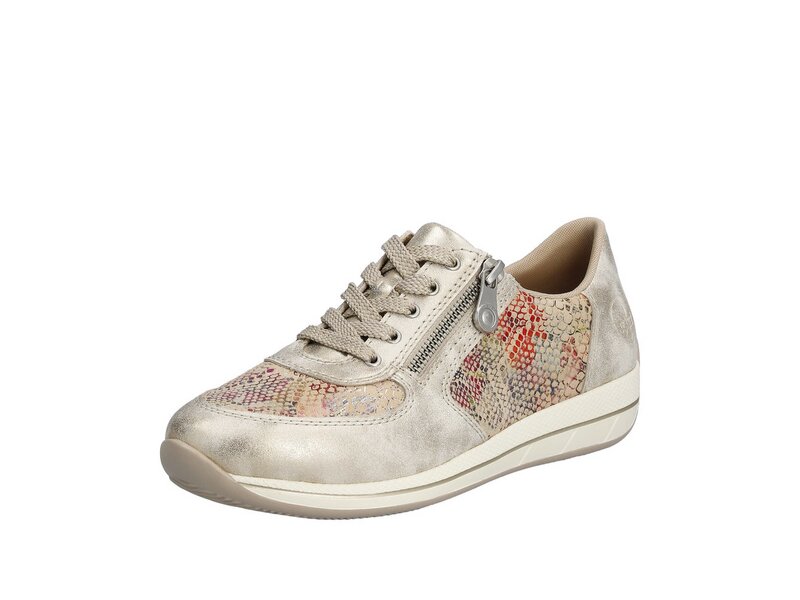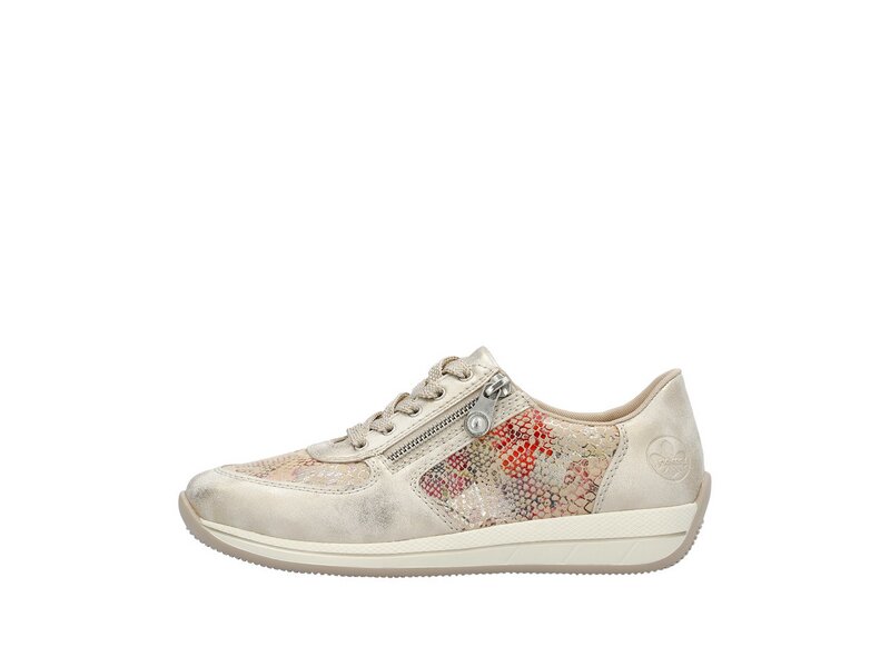 Dream-Team – Style und Comfort! Diese lässigen beigen Rieker Sneaker sind schlicht und praktisch. Der Reißverschluss wird durch eine Schnürung ergänzt und garantiert somit optimalen Halt und eine perfekte Passform. Das mehrfarbige Muster rundet das moderne Design perfekt ab. Die schockabsorbierende und leichte Sohle verwöhnt die Füße darüber hinaus bei jedem Schritt. Dank der herausnehmbaren Einlegesohle ist bester Komfort und raffinierte Funktionalität gegeben. Durch die Extraweite H haben die Füße mehr Platz im Schuh. Einfach top!