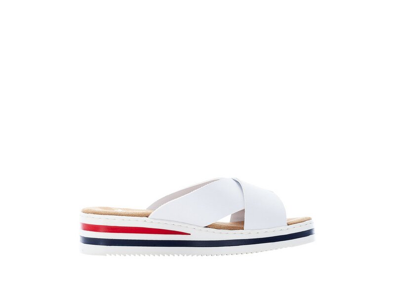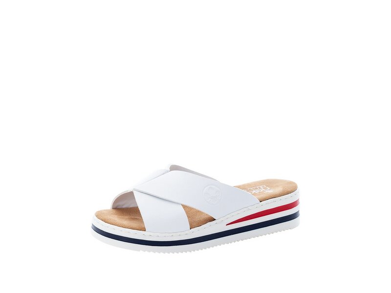 Pantoletten for the win! Diese perlweißen Pantoletten aus Kunstleder von Rieker garantieren ein himmlisches Tragegefühl. Das Modell hat keinen Verschluss und kann so einfach angezogen werden. Die leichte und schockabsorbierende Sohle mit Keilabsatz federt jeden Schritt gekonnt ab. Ein weiteres Plus ist die extra weiche Decksohle. Durch die schmale Passform E 1/2 bieten die Pantoletten zusätzlichen Halt. Modisches Wellness-Feeling im Stil von Rieker!