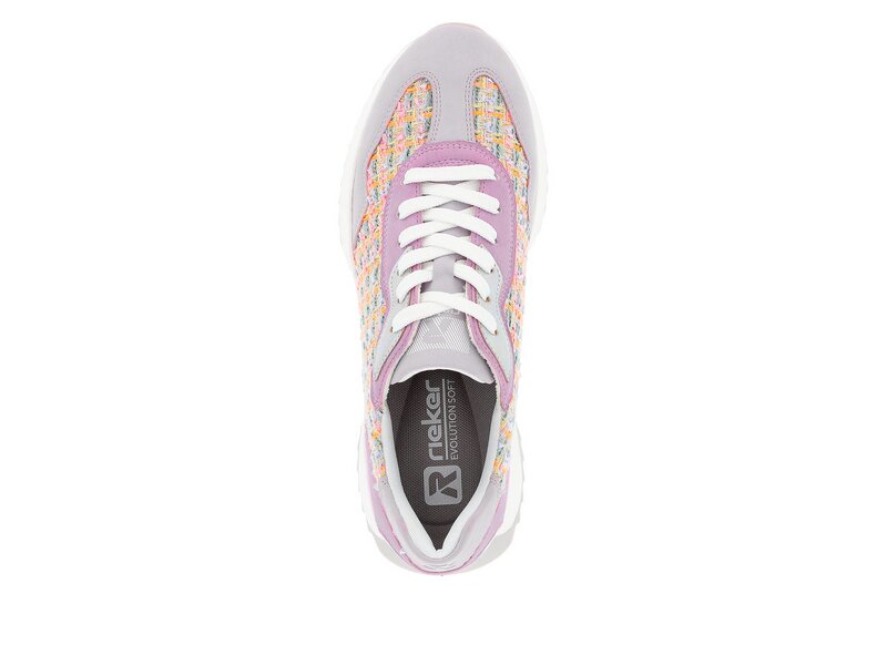 Mehr Bewegungsfreiheit für die Füße! Diese bunten Rieker EVOLUTION Sneaker sind die perfekten Allrounder in dieser Saison. Zudem werden guter Halt und perfekte Passform durch die weiße Schnürung garantiert. Die robuste Laufsohle erhält ein Upgrade: Sie ist mit einer ultra-leichten, super weichen Zwischensohle ausgestattet, die das Auftreten noch angenehmer macht. Ein funktionales und komfortables Plus ist die gepolsterte und herausnehmbare Einlegesohle. Der Schuh ist in Komfortweite G 1/2 geschnitten. Dank der atmungsaktiven Innenfütterung aus Microvelour ist idealer Tragekomfort garantiert. Da steht langen Spaziergängen nichts mehr im Weg!