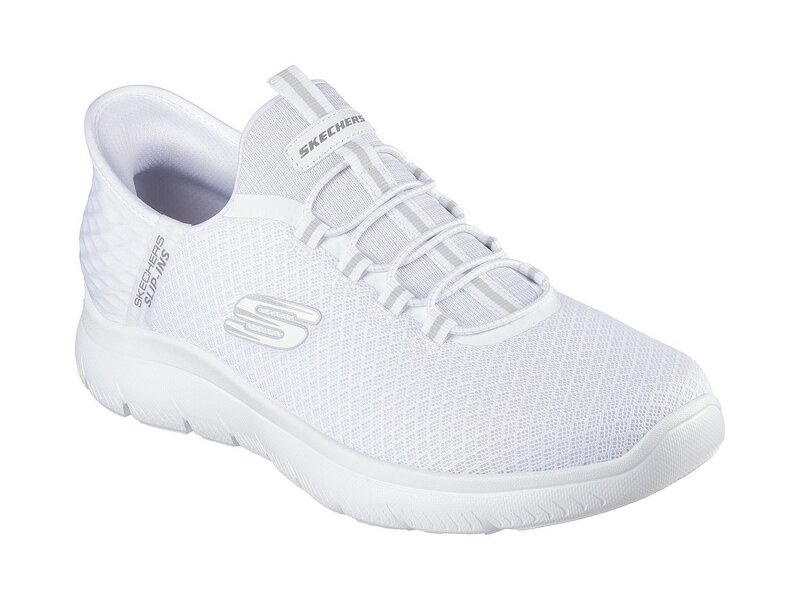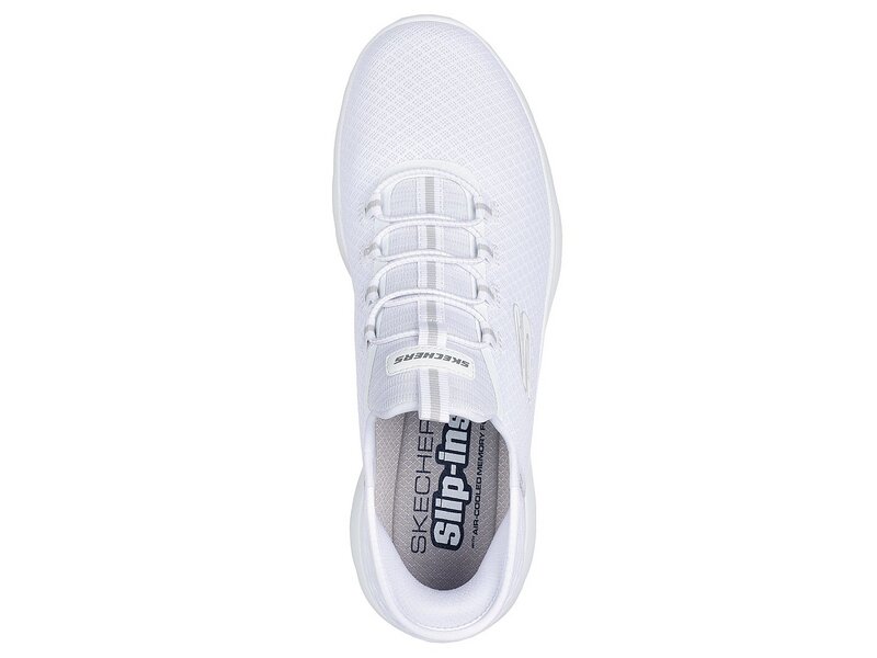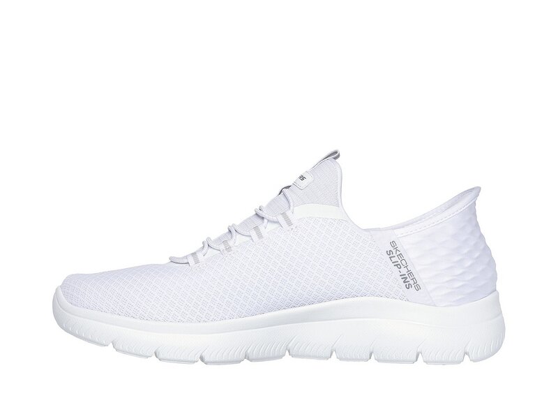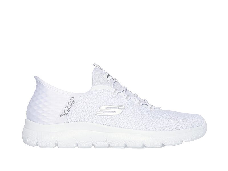 Ultimativer Tragekomfort mit Skechers Hands Free Slip-ins: Summits - High Range. Zusammen mit unserem exklusiven Heel Pillow, das Ihren Fuß sicher an Ort und Stelle hält, verfügt dieser vegane Schuh über das einzigartig geformtes Pop-up-geformtes Fersenpanel der Skechers Slip-ins, ein Obermaterial aus Mesh mit fixierten Schnürsenkeln und eine gepolsterte Innensohle aus Skechers Air-Cooled Memory Foam®.