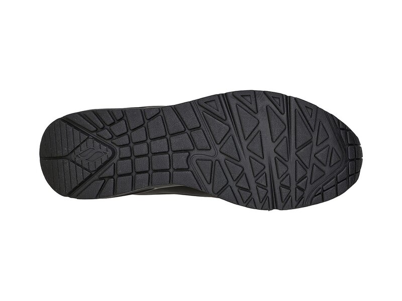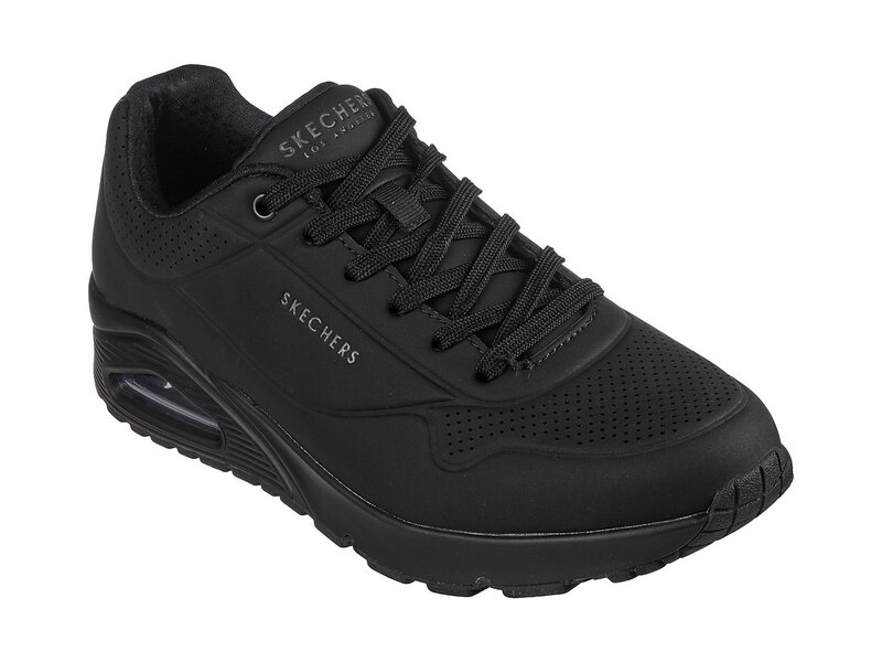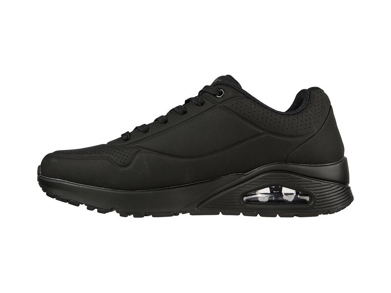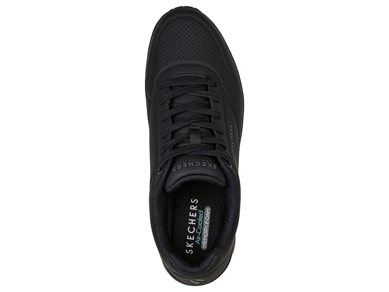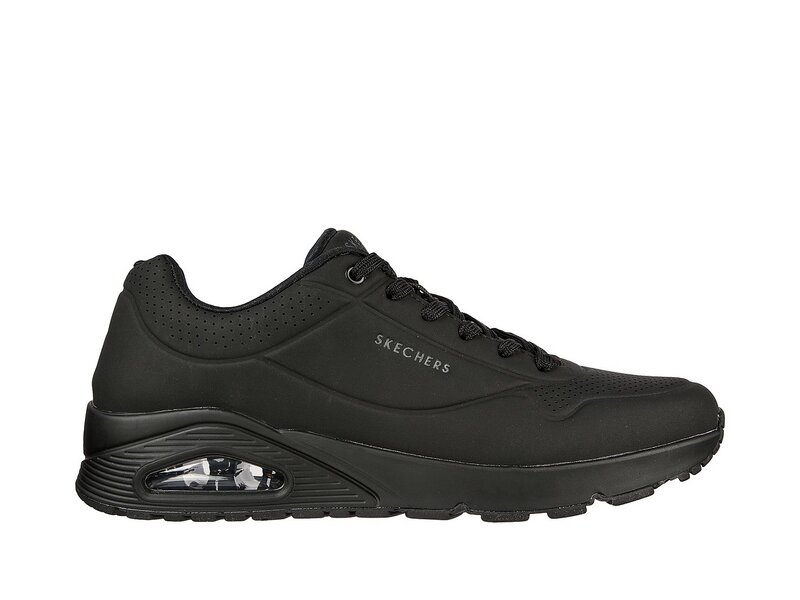 Klassischer luftgepolsterter Look trifft auf modernen Komfort im SKECHERS Uno - Stand on Air Schuh. Klassischer, sportlicher Sneaker im Joggerstil zum Schnüren mit einem Obermaterial aus Synthetik mit Glattlederstruktur sowie Ziernähten und Perforationen. Air Cooled Memory Foam Innensohle, sichtbare Zwischensohle mit Luftkissen-Dämpfung.