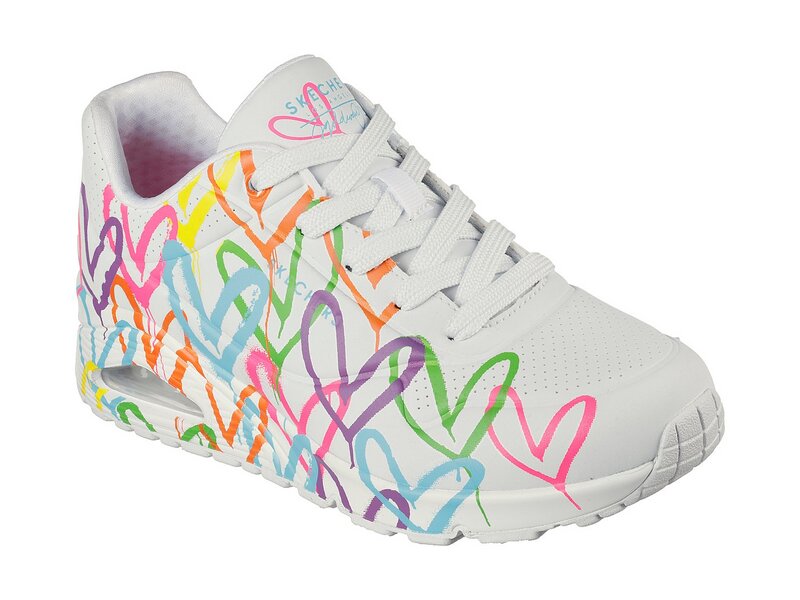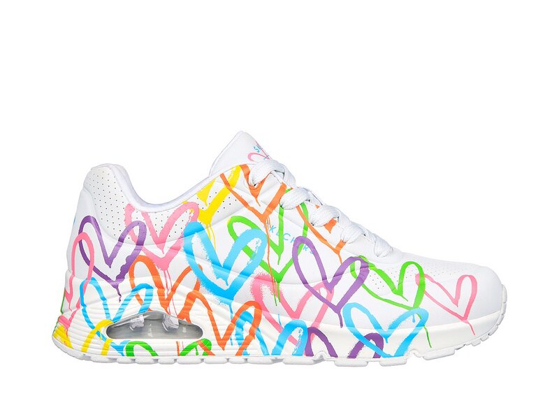 Der Skechers x JGoldcrown: Skechers Street Uno – Highlight Love in Weiß mit bunten Herzen vereint kunstvolles Design mit sportlichem Komfort.