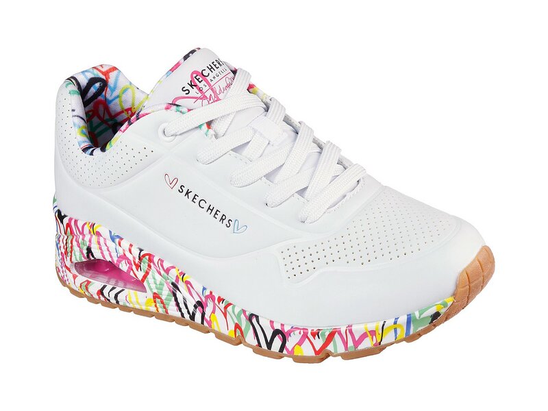 Mit dem Skechers x JGoldcrown: Skechers Street Uno – Loving Love in Weiß mit bunter Sohle bist du stets mit „Liebe“ unterwegs.
