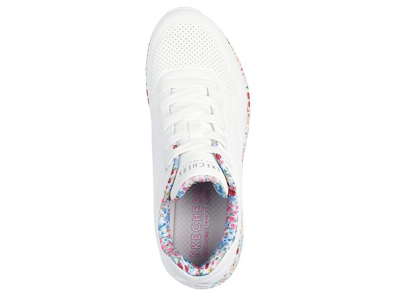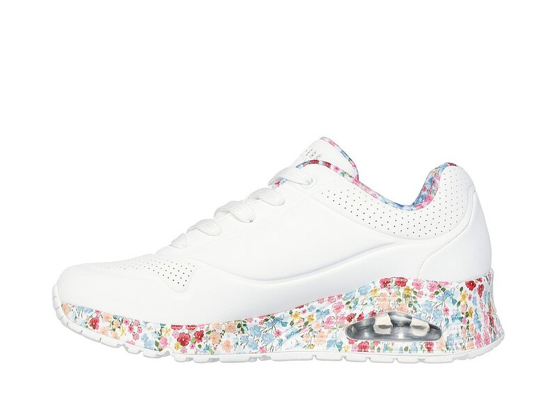 Genieße die Schönheit der Natur im Skechers Street Uno – Majestic Garden. Dieser modische Schnürsneaker verfügt über ein Obermaterial aus synthetischem Durabuck mit floralem Muster, eine Skechers Air-Cooled Memory Foam-Innensohle und eine Skech-Air® Zwischensohle mit sichtbarer Luftkissenpolsterung.