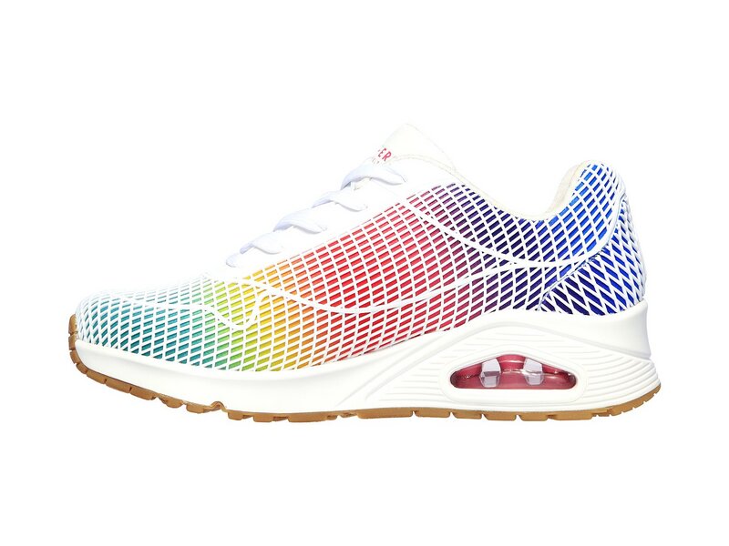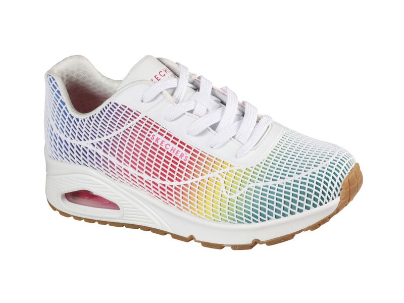 Hohen Tragekomfort in Kontrastfarben bietet dir der SKECHER Street Uno - Eye Catching Schuh. Modisch-klassischer Sneaker mit Schnürung, einem Obermaterial aus Synthetiklagen und Stoff sowie Ziernähten. Air Cooled Memory Foam Innensohle, sichtbare Zwischensohle mit Luftkissen-Dämpfung.