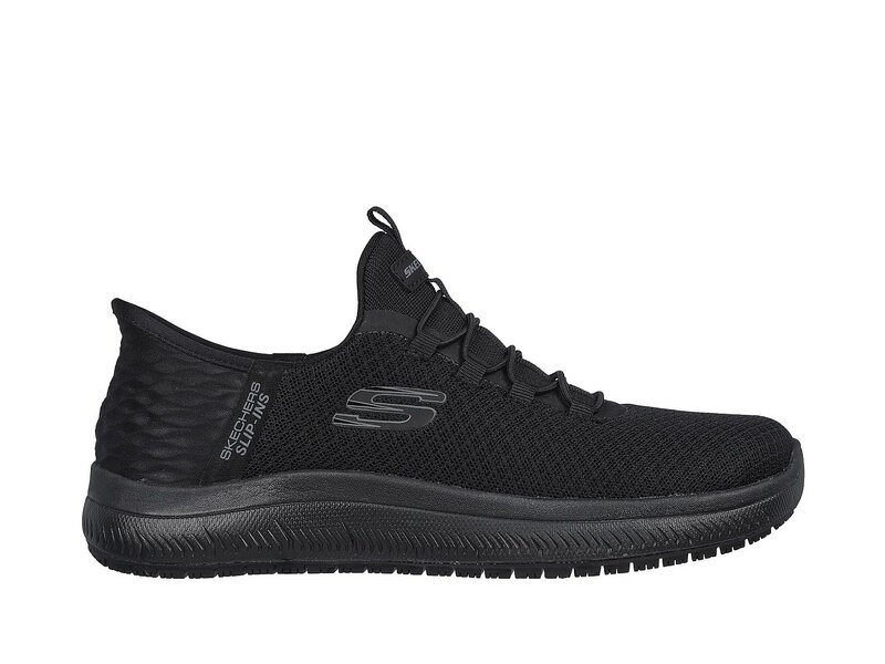 Trittsicher und bequem zum Hineinschlüpfen – der Skechers Hands Free Slip-ins Work: Summits SR - Enslee. Dieses TOUCHLESS FIT®-Modell für Arbeit & Sicherheit verfügt über ein Obermaterial aus Strick-Mesh und Synthetik mit unserem einzigartigen Heel Pillow, eine rutschhemmende Laufsohle und eine gepolsterten Skechers Air-Cooled Memory Foam Komfort-Innensohle.