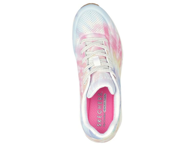Tolle Farben sorgen für gute Laune beim Skechers Street™ Uno – Hyped Hippie Schuh. Schnürsneaker mit einem Obermaterial aus Durabuck-Synthetik und Batikaufdruck, Air-Cooled Memory Foam® Innensohle und einer Plateausohle mit sichtbarer Skech-Air® Luftkissen-gedämpften Zwischensohle.