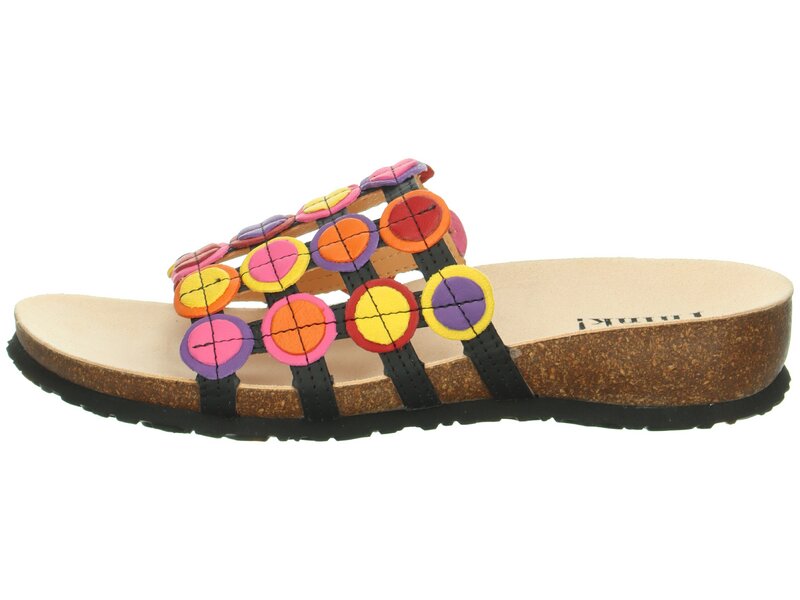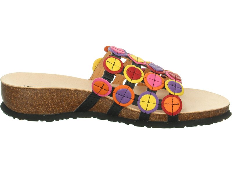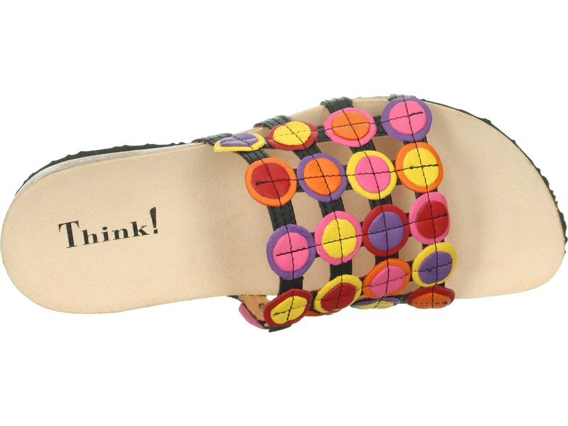 Luftig, stylish und fröhlich ist die Tieffußbettpantolette JULIA genau richtig für den Sommer. Das Material der Think! Pantolette schmiegt sich angenehm an den Fuß und garantiert einen ausgezeichneten Tragekomfort. Die breite Anordnung der gitterförmig angelegten Riemchen über dem Rist sorgt für optimalen Halt. Die verspielten Leder-Kreise und farbigen Sohlen machen JULIA zum echten Highlight.