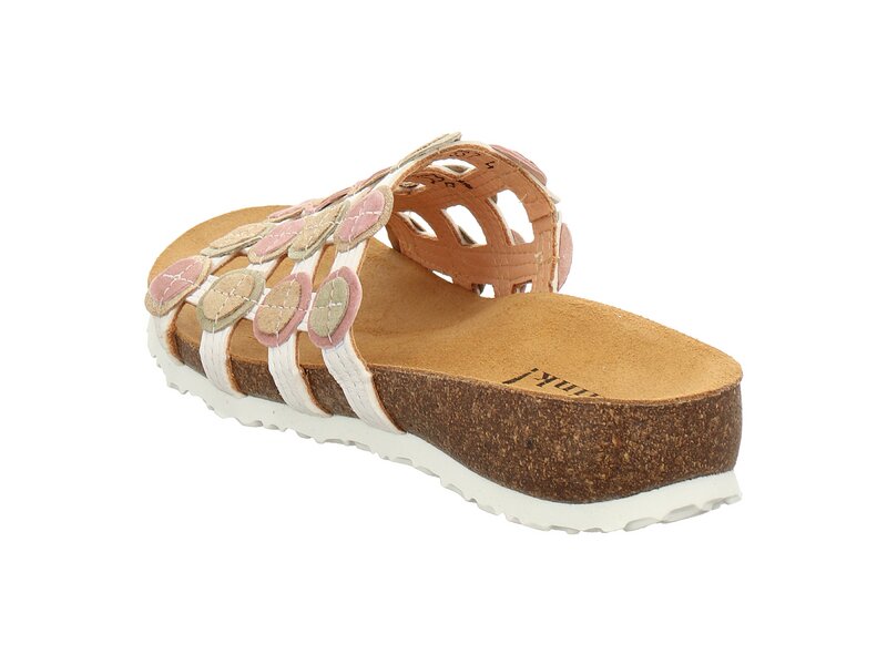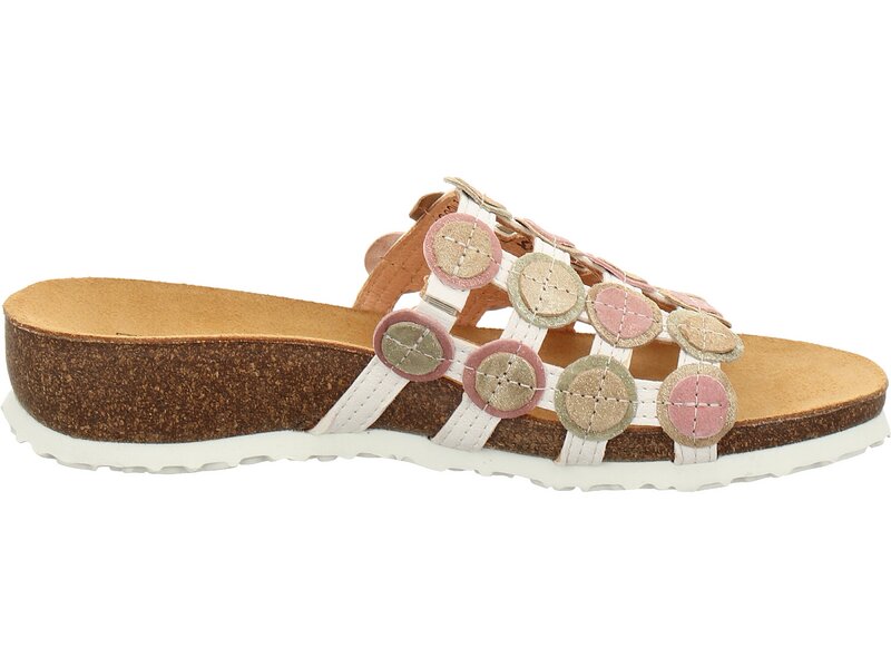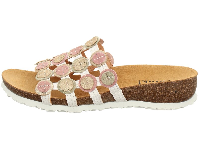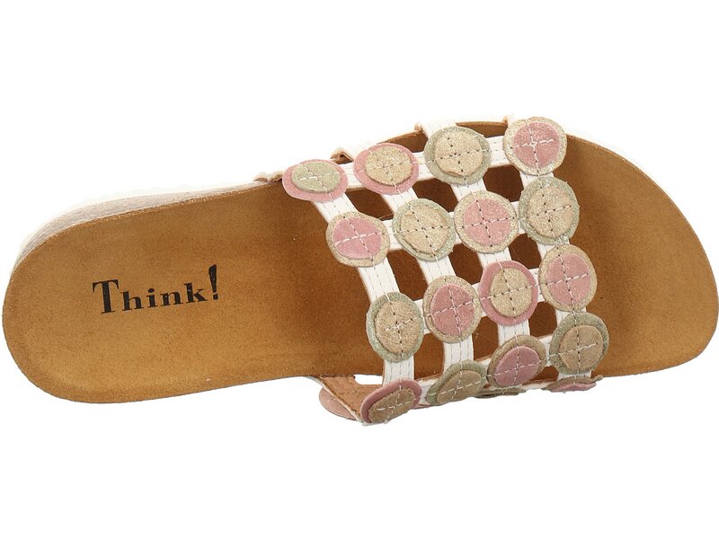 Luftig, stylish und fröhlich ist die Tieffußbettpantolette JULIA genau richtig für den Sommer. Das Material der Think! Pantolette schmiegt sich angenehm an den Fuß und garantiert einen ausgezeichneten Tragekomfort. Die breite Anordnung der gitterförmig angelegten Riemchen über dem Rist sorgt für optimalen Halt. Die verspielten Leder-Kreise und farbigen Sohlen machen JULIA zum echten Highlight.
