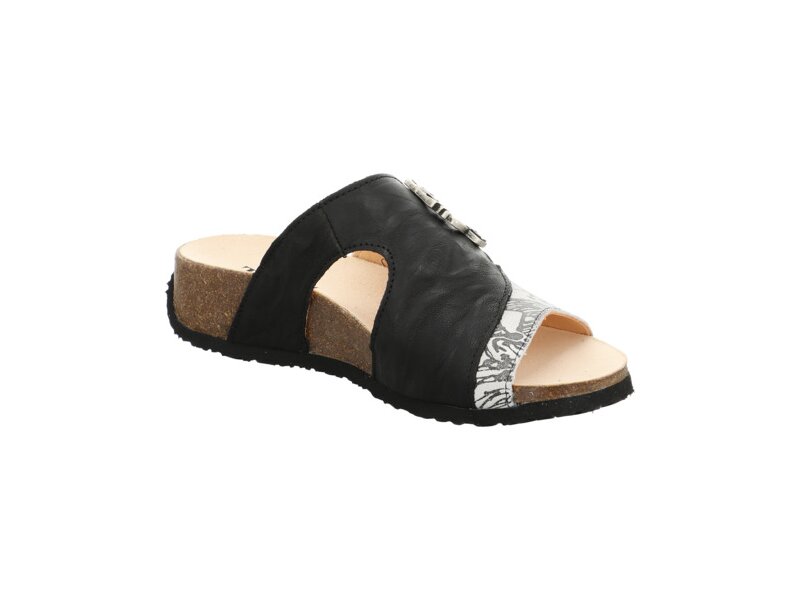 Die fröhliche Pantolette MIZZI besticht durch die Metallapplikationen und den Riemenabschluss in Streifenoptik, die ihr einen einzigartigen Look verleihen. Das schwarze Modell 3-000124-0010 wurde mit dem Österreichischen Umweltzeichen sowie dem Blauen Engel (www.blauerengel.de/uz155) ausgezeichnet, was seine Nachhaltigkeit entlang der gesamten Wertschöpfungskette belegt.