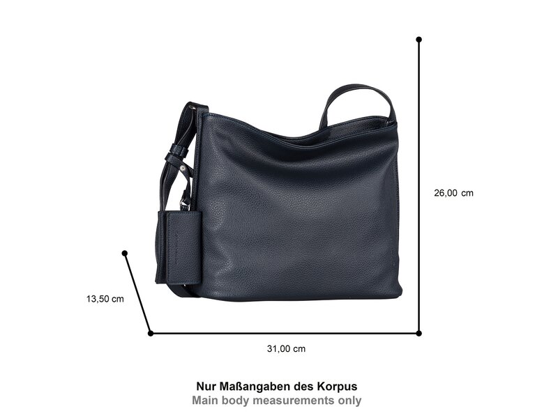 Weiches Lederimitat, die geradlinige Schnittführung und eine klare, kühle Farbgebung verschmelzen bei der Serie Amarea zu einer angenehmen Symbiose an Modernität, die keinen Kompromiss stilistischer Art zulässt. Die Besonderheiten der Modelle sind die auffallende Kantenverarbeitung sowie der funktionale, abnehmbare Anhänger. Mittelgroße Beuteltasche mit Reißverschlusshauptfach. 1 Reißverschlussfach hinten. 1 Reißverschlussfach, 1 Handyfach, 1 Steckfach innen. 1 fixierter, verstellbarer Schulterriemen, 1 abnehmbare Anhängertasche.