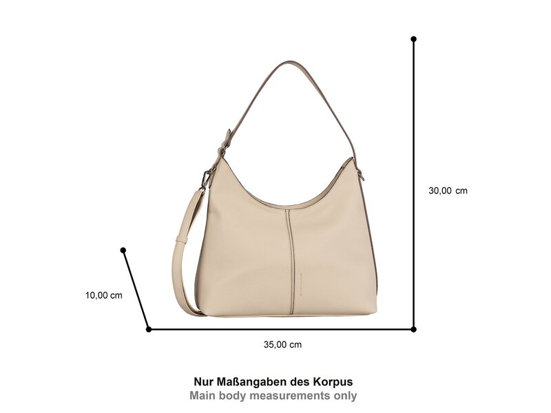 Die Serie Jema von Tom Tailor kombiniert trapezförmige und klare Formate in minimalistischer Optik mit einer zurückhaltenden Farbgebung. So verbindet sich Minimalismus mit Funktionalität zu einem kombinationsstarken Begleiter. Mittelgroße Beuteltasche mit Reißverschlusshauptfach. 1 Reißverschlussfach hinten. 1 Reißverschlussfach, 1 Handyfach, 1 Steckfach innen. 1 Henkel, 1 abnehmbarer, verstellbarer Schulterriemen.