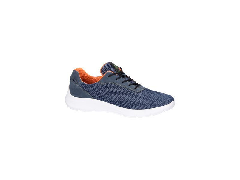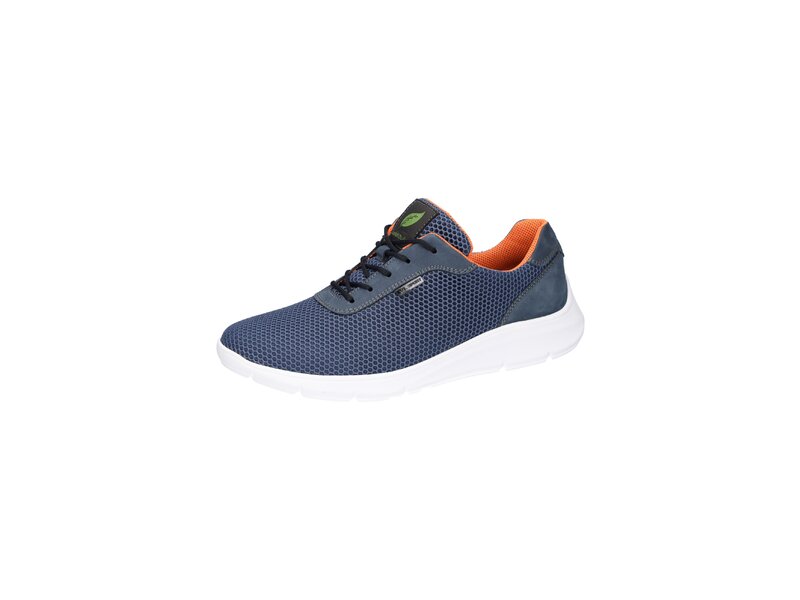 Stylisch; funktional: Der Herren-Sneaker Haris kombiniert Nubukleder in Jeansblau mit modernen Mesh-Materialen. Was den besonderen Komfort dieses Waldläufers ausmacht? Annehmlichkeiten wie die Bequemweite H für den etwas stärkeren Fuß oder die herausnehmbare Leder-Innensohle mit Luftpolsterung und die flexible PU-Laufsohle.
